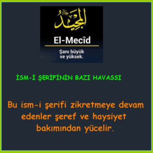 Mecid İsmi Şerifi, her türlü zorlukları aşmak için başvurulan önemli bir dua kaynağıdır.'Yâ Mecid Yâ Vâsi' şeklinde zikredilmesi, birçok insana güç vererek mucizelere kapı açmaktadır.